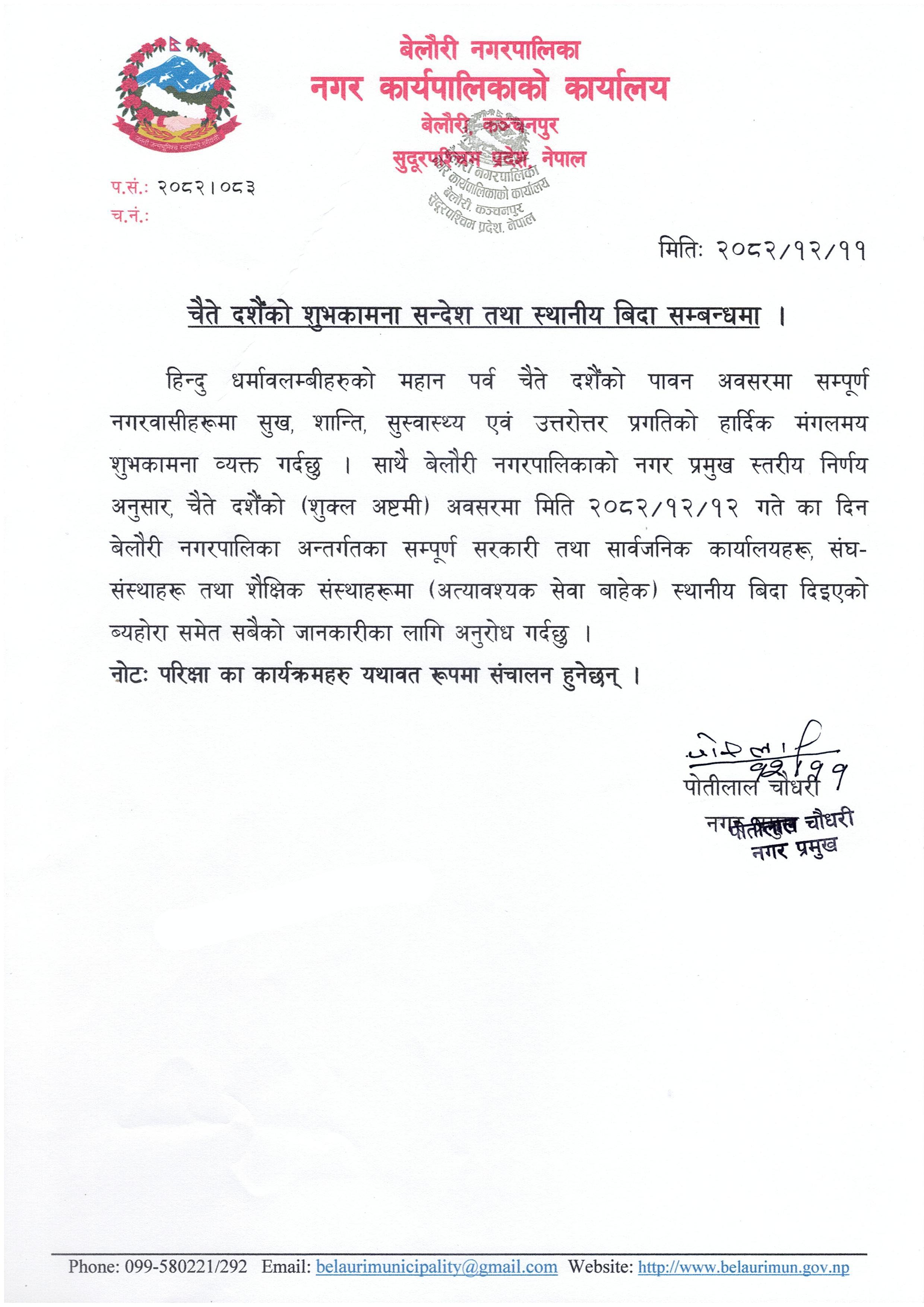 चैते दशैँको शुभकामना सन्देश तथा स्थानीय बिदा सम्बन्धमा ।