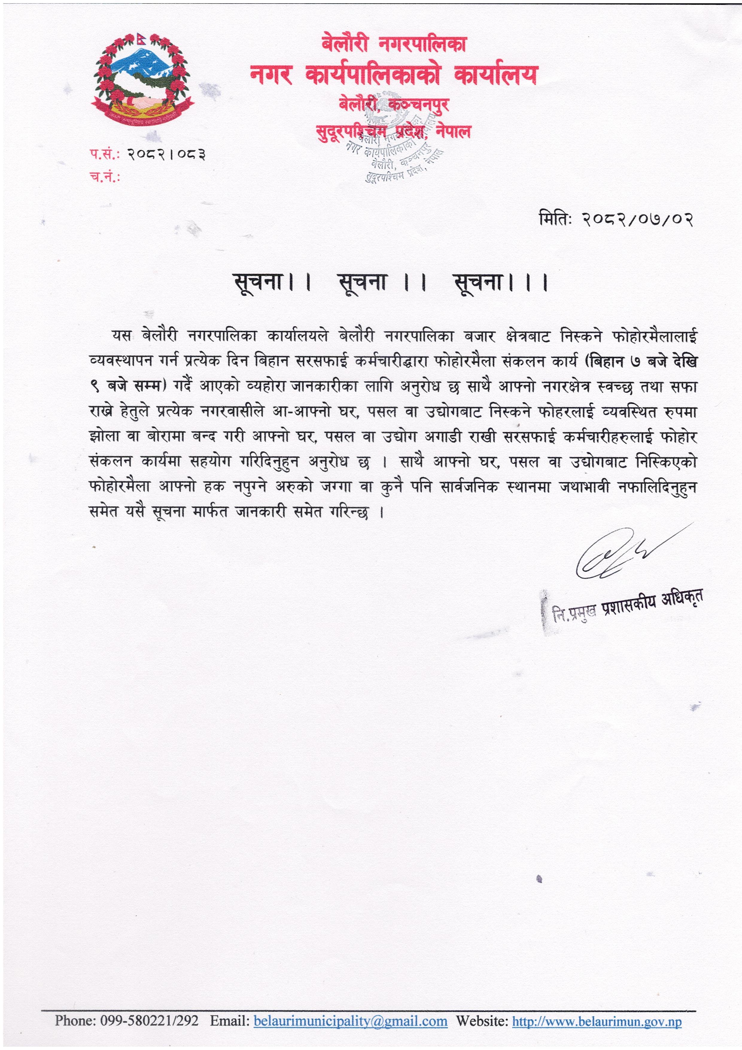 फोहोरमैला संकलन तथा व्यवस्थापन सम्बन्धि सूचना ।