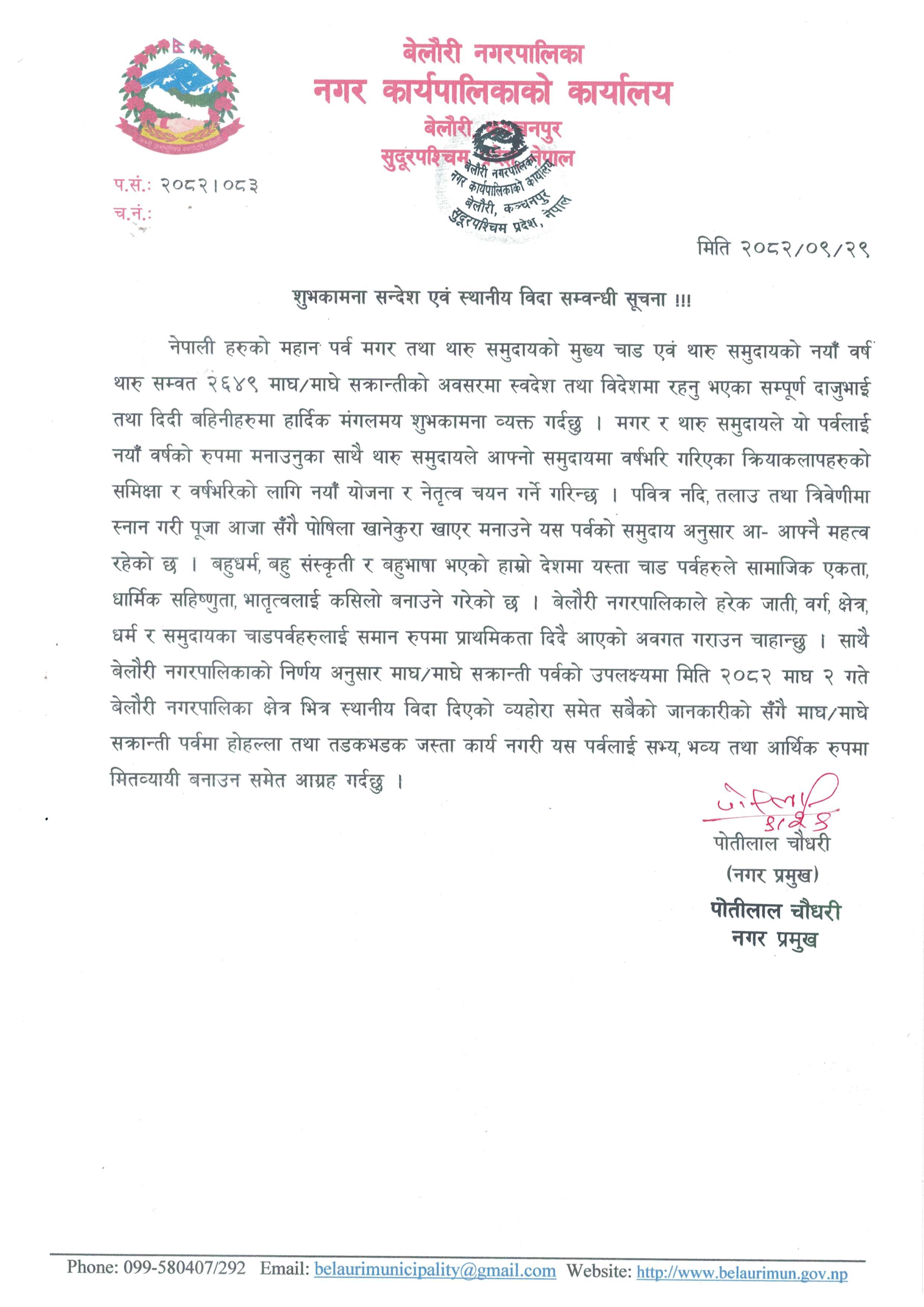 शुभकामना सन्देश एवं स्थानीय बिदा सम्बन्धी सूचना