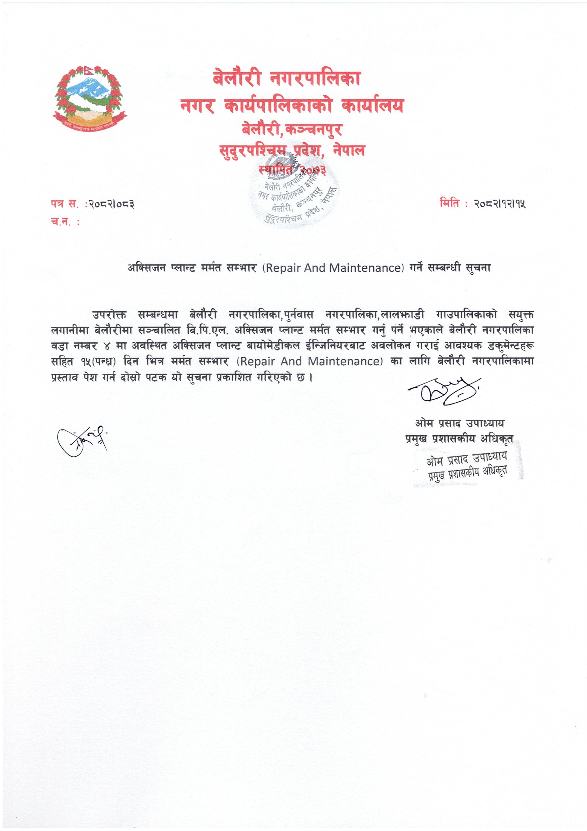 » अक्सिजन प्लान्ट (Repair and Maintenance) मर्मत सम्भार गर्ने सम्बन्धी सूचना ।
