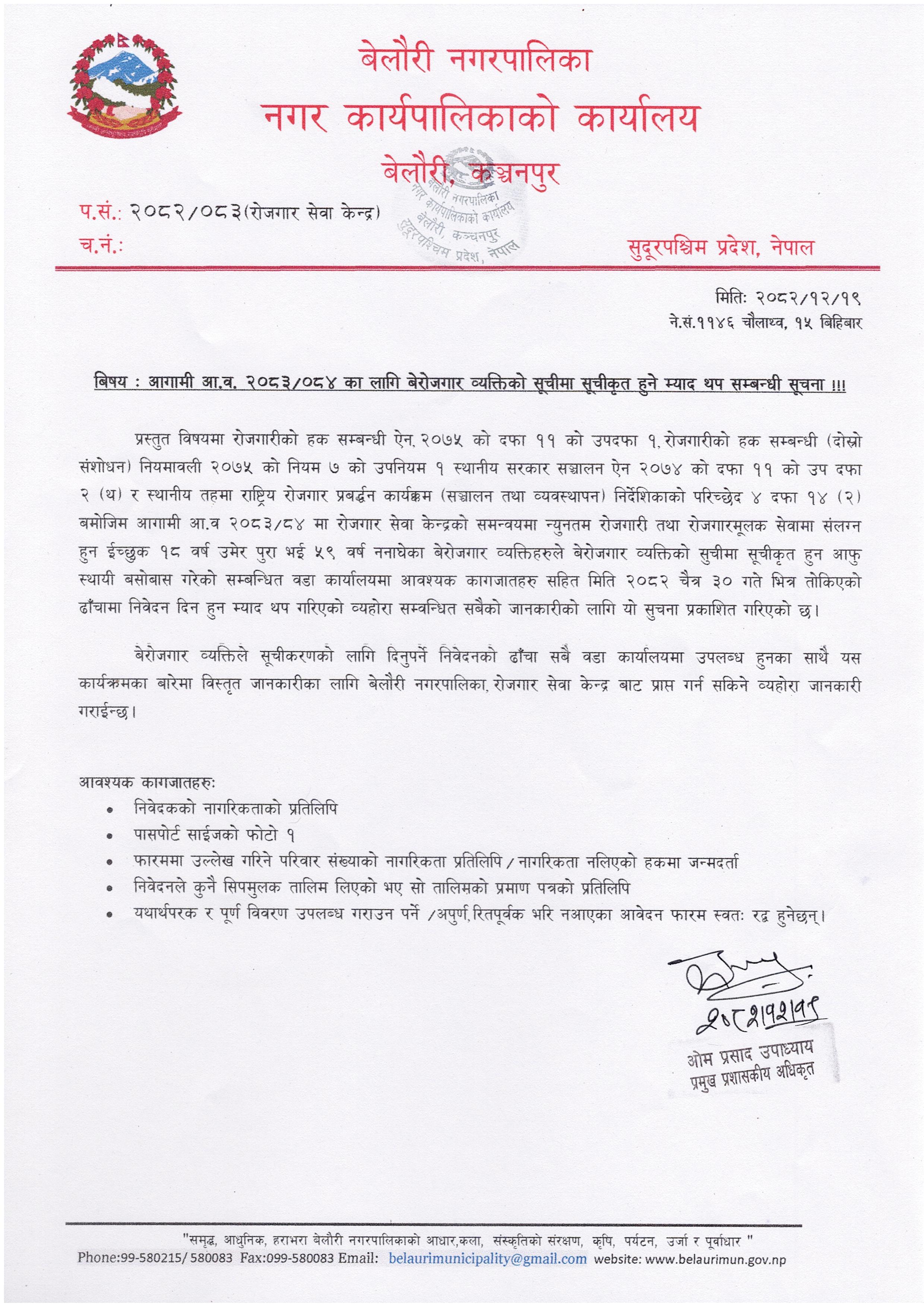 आगामी आ.व. २०८३-०८४ का लागि बेरोजगार व्यक्तिको सूचीमा सूचीकृत हुने म्याद थप सम्बन्धी सूचना