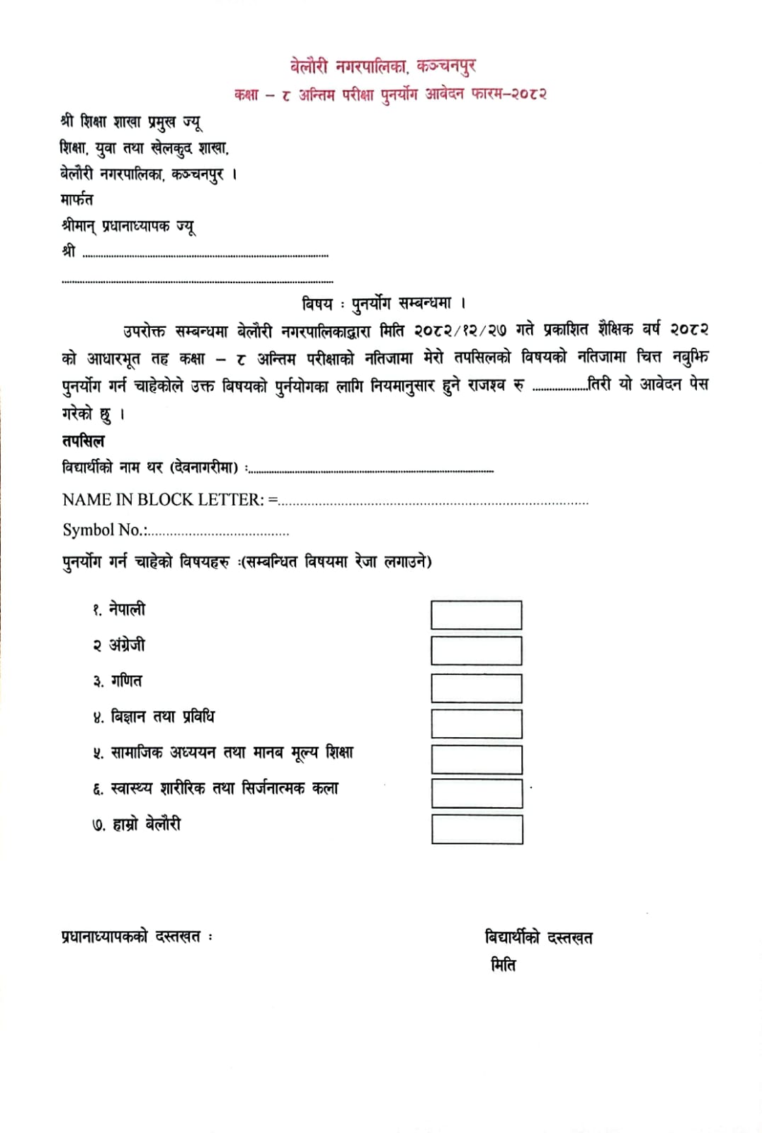 कक्षा - ८ अन्तिम परीक्षा पुनर्योग आवेदन फारम २०८२