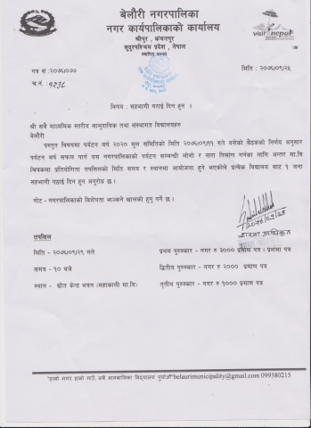» बेलाैरी नगरपालिका स्थित सबै माध्यमिक स्तरीय सामुदायिक तथा सस्थागत बिद्यालयहरु सहभागी भइ दिन हुन ।।।
