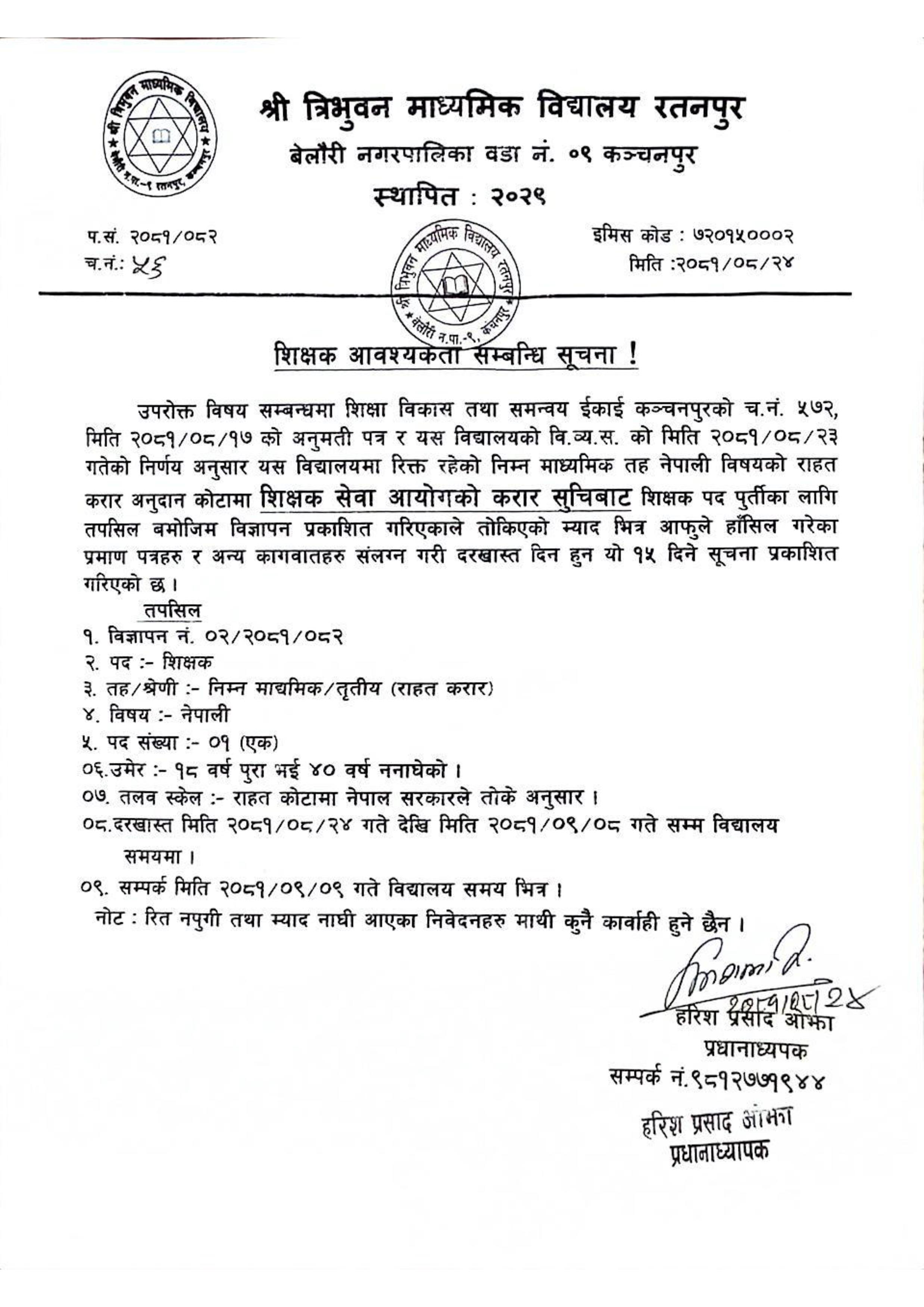 शिक्षक आवश्यकता सम्बन्धी सूचना ।