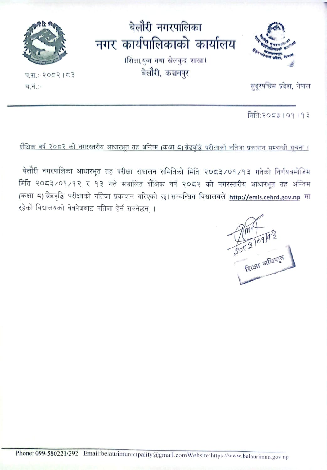 शैक्षिक वर्ष २०८२ को नगरस्तरीय आधारभूत तह अन्तिम (कक्षा ८) ग्रेडवृद्धि परीक्षाको नतिजा प्रकाशन सम्बन्धी सूचना ।