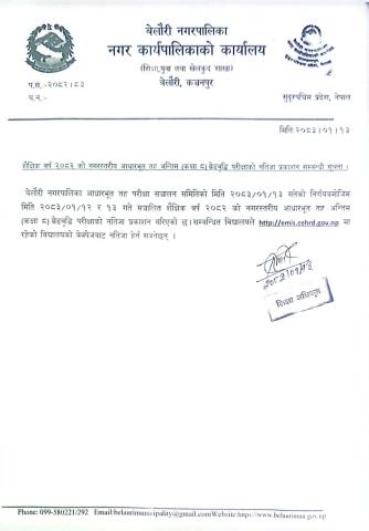 » शैक्षिक वर्ष २०८२ को नगरस्तरीय आधारभूत तह अन्तिम (कक्षा ८) ग्रेडवृद्धि परीक्षाको नतिजा प्रकाशन सम्बन्धी सूचना ।