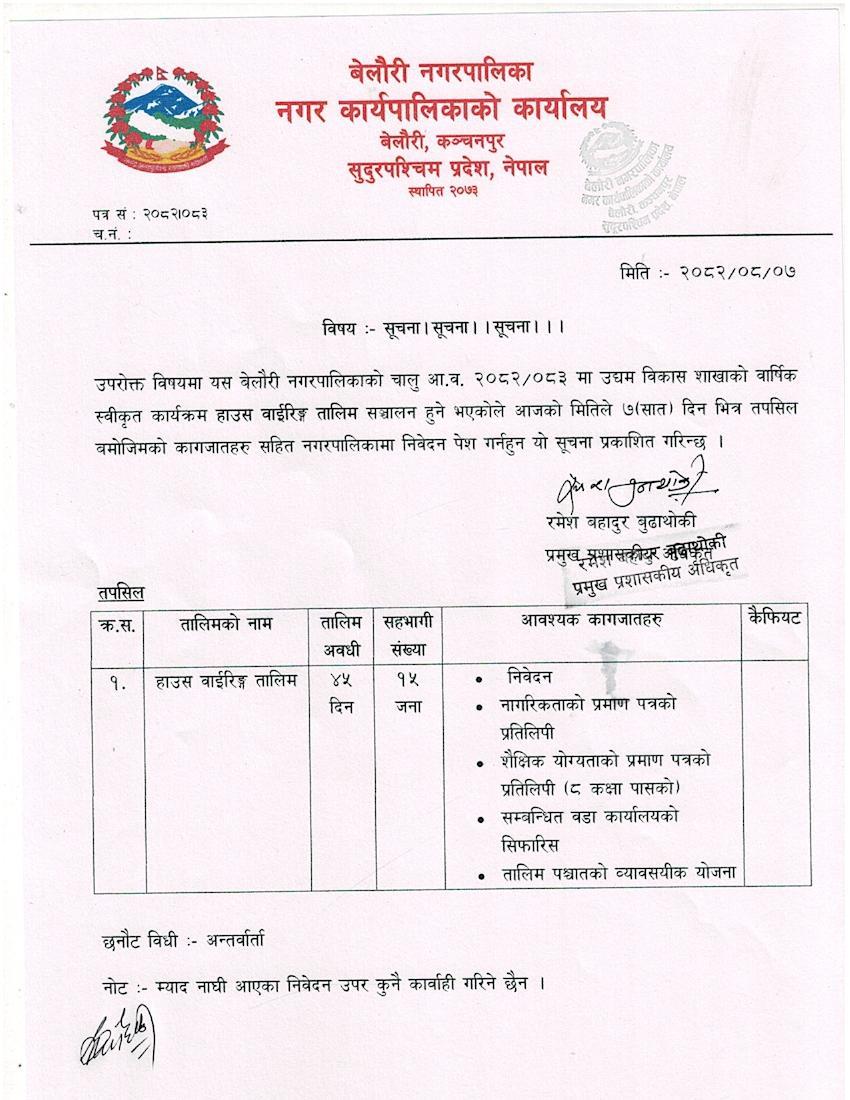 हाउस वाईरिङ्ग तालिम सूचना ।